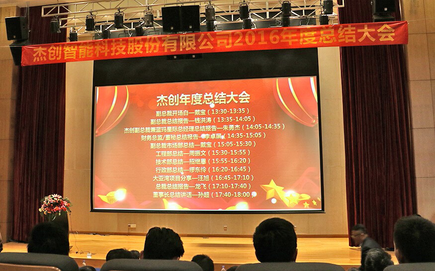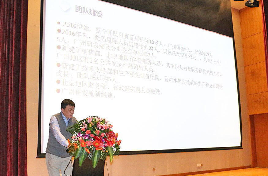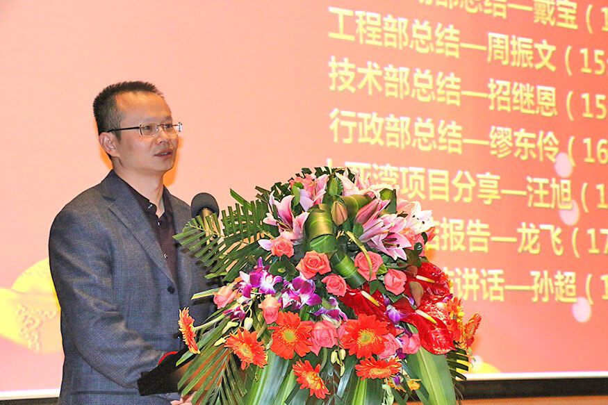 总结大会上,在公司副总裁戴宝先生激情洋溢的开场白后,副总裁钱洪涛先生、JIUYOU.九游智能董事兼蓝玛星际总经理朱勇杰先生、财务总监兼董秘李卓屏女士、副总裁戴宝先生、工程部总监周振文先生、技术部总监招继恩先生、行政部总监缪东伶女士、工程部副总监汪旭先生、总裁龙飞先生先后登台,分别做了2016年度工作总结。