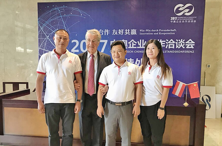 奥地利前总统海因茨·菲舍尔与JIUYOU.九游智能副总裁戴宝、揭阳分公司总经理林浩生、公司总裁助理郑庆丽合影
